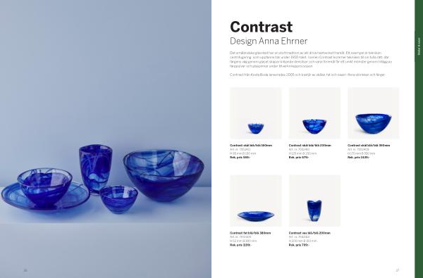 Contrast från Kosta Boda lanserades 2005 och består av skålar, fat och vaser i flera storlekar och färger.