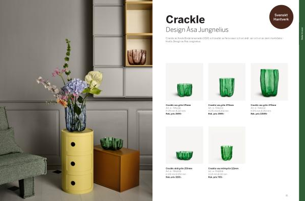 Crackle av Kosta Boda lanserades 2020 och består av flera vaser och en skål, var och en av dem munblåsta i Kosta. Design av Åsa Jungnelius.