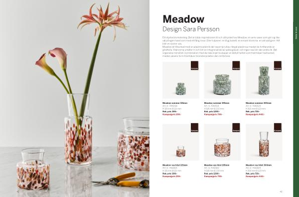 Ett stycke blomsteräng. Det är både inspirationen till och uttrycket hos Meadow, en serie vaser som gör sig lika väl på egen hand som med ett fång rosor. Eller tulpaner, en blyg bukett, en ensam blomma, en väl vald gren. Allt klär en vacker vas. Meadow är tillverkad med en glaskrossteknik där vaserna rullas i färgat glaskross medan de fortfarande är glödheta. Skärvorna smälter in och blir en integrerad del av själva glaset, och ingen vas blir den andra lik. Det organiska mönstret i kombination med de raka linjerna skapar en lekfull helhet som framhäver hantverket, medan vasens form framhäver blomsterprakten den omfamnar.