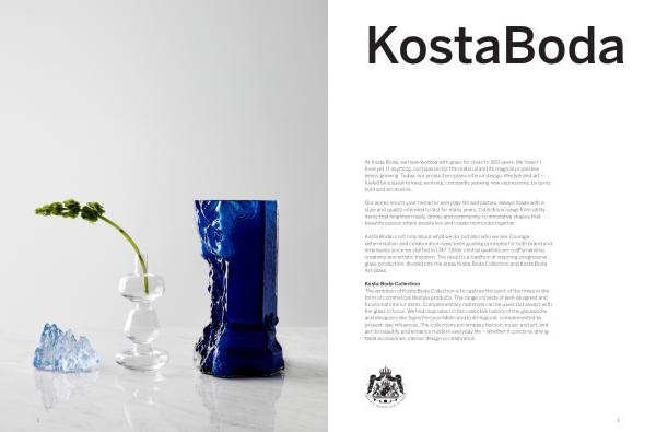 Kosta Boda Collection The ambition of Kosta Boda Collection is to capture the spirit of the times in the form of commercial lifestyle products. The range consists of well-designed and functional interior items. Complementary materials can be used, but always with the glass in focus. We find inspiration in the collective history of the glassworks and designers like Signe Persson-Melin and Erik Höglund, complemented by present-day influences. The collections encompass fashion, music and art, and aim to beautify and enhance modern everyday life – whether it concerns diningtable accessories, interior design or celebration.