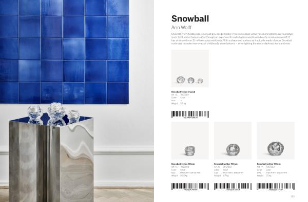 Snowball from Kosta Boda is not just any candle holder. This iconic glass votive has illuminated its surroundings since 1973, when it was created through an experiment in which glass was blown directly inside a snowdrift. It has since sold over 15 million copies worldwide. With a shape and surface as if actually made of snow, Snowball continues to evoke memories of childhood’ s snow lanterns – while lighting the winter darkness here and now.