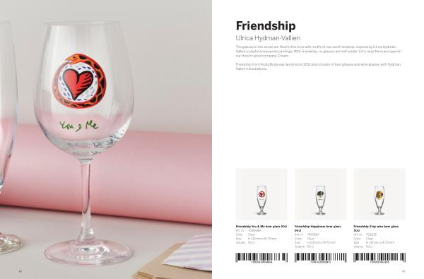 Friendship from Kosta Boda was launched in 2011 and consists of beer glasses and wine glasses with Hydman Vallien’ s illustrations.