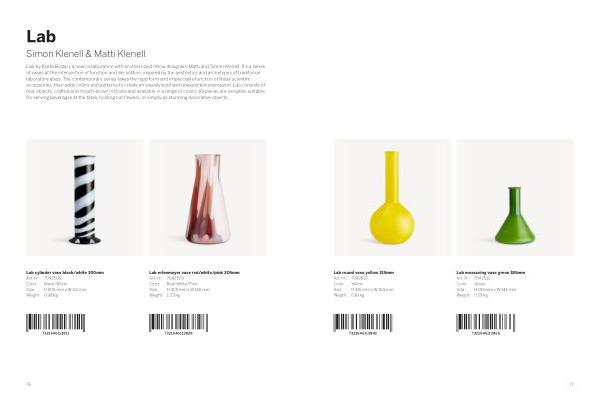 Lab by Kosta Boda is a new collaboration with brothers and fellow designers Matti and Simon Klenell. It’ s a series of vases at the intersection of function and decoration, inspired by the aesthetics and archetypes of traditional laboratory glass. The contemporary series takes the rigid form and impeccable function of these scientific accessories, then adds colors and patterns to create an equally bold and unexpected expression. Lab consists of four objects, crafted and mouth-blown in Kosta and available in a range of colors. All pieces are versatile, suitable for serving beverages at the table, holding cut flowers, or simply as stunning decorative objects.