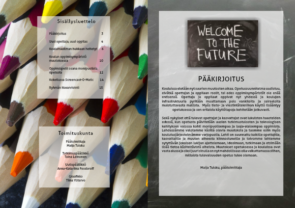 Sekä nykyiset että tulevat opettajat ja kasvattajat ovat lukuisten haasteiden edessä, kun opetusta päivitetään uusien tutkimustulosten ja teknologisen kehityksen valossa kohti monipuolisempaa ja laaja-alaisempaa oppimista. Lehdessämme valotamme käsillä olevia muutoksia ja tuomme esiin myös koulutusjärjestelmämme varjopuolia. Lehti on suunnattu kaikille opettajille, kasvattajille ja muuten aiheesta kiinnostuneille ja toivomme lehtemme sytyttävän jokaisen lukijan ajattelemaan, ideoimaan, tutkimaan ja etsimään lisää tietoa käsiteltävistä aiheista. Muutokset opetuksessa ja kouluissa ovat vasta alussa ja siksi juuri sinulla on nyt mahdollisuus olla vaikuttamassa siihen, millaista tulevaisuuden opetus tulee olemaan.