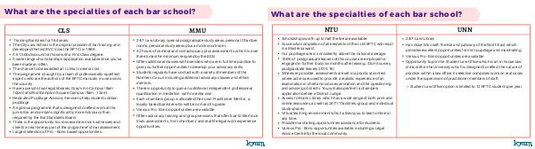 What are the specialties of each bar school?