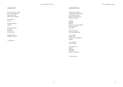 Marzena D?browa Szatko Z DESZCZEM lato schowa?o si? w szafie ze sztywnym paj?kiem dogorywaj? klony niebo kracze na deszcz jeszcze jestem mówisz za oknem stukanie zamarza moja twarz sp?ywa po szybie przetapia si? w widok ulicy w?sk? szczelin? wsi?kamy w ziemi? ( 25.08.2006 )