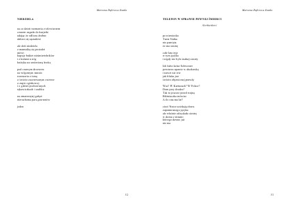 Marzena D?browa Szatko NIEDZIELA na co dzie? rozmawia z telewizorem czasem zagada do kasjerki udaj?c ?e odlicza drobne uk?oni si? s?siadowi ale dzi? niedziela z mamu?k? si? posiedzi mówi kupuje bukiet nie?miertelników i z kulami u nóg ku?tyka na umówion? ?awk? pod czarnym drzewem na wilgotnym mrozie rozmawia z ?on? o ?wie?o zacerowanym swetrze o zupie ogórkowej i o gdzie? pochowanych r?kawiczkach i szaliku na zmarzni?tej ga??zi nieruchoma para gawronów jeden
