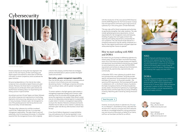 In December 2022 , a new cybersecurity guide for directors and executives was published . The guide provides specific and operational recommendations and proposals and takes into account – to the extent possible – the upcoming NIS2 requirements . We have prepared the guide in collaboration with i . a . the Danish Industry Foundation , the Cyber Competence Centre of the Board Leadership Society , Dubex , the Centre for Cybersecurity , Copenhagen Business School , and the Cyber Security Group of Aalborg University . Read the guide in Danish by clicking the button below .