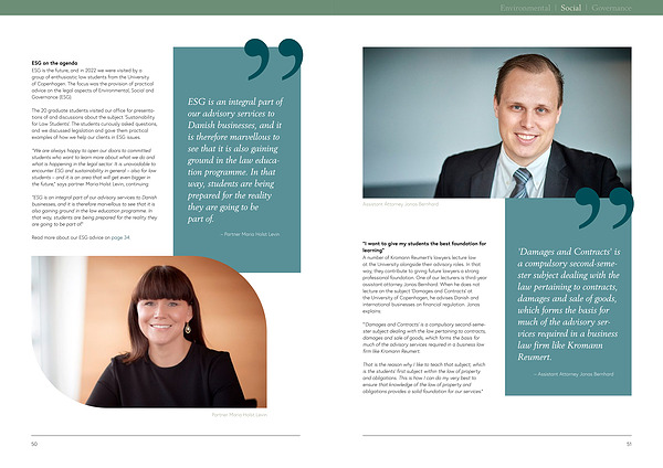 ESG on the agenda ESG is the future , and in 2022 we were visited by a group of enthusiastic law students from the University of Copenhagen . The focus was the provision of practical advice on the legal aspects of Environmental , Social and Governance ( ESG ).
