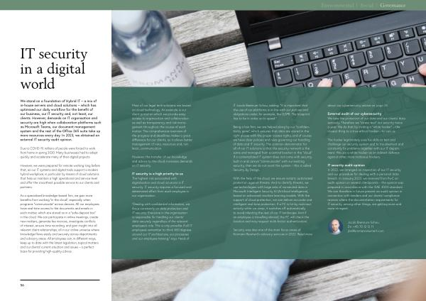 We stand on a foundation of Hybrid IT – a mix of in-house servers and cloud solutions – which has optimised our daily workflow for the benefit of our business , our IT security and , not least , our clients . However , demands on IT organisation and security are high when collaboration platforms such as Microsoft Teams , our document management system and the rest of the Office 365 suite take up more resources every day . In 2023 , we obtained an external IT security audit opinion .