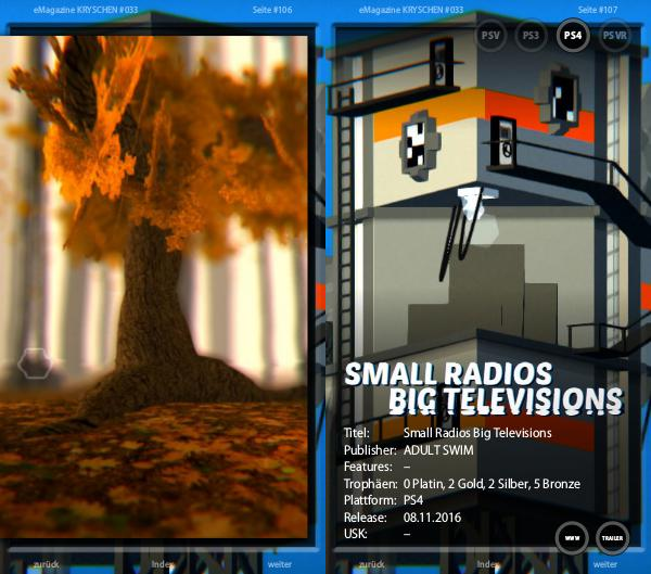 Titel: Small Radios Big Televisions Publisher: ADULT SWIM Features: – Trophäen: 0 Platin, 2 Gold, 2 Silber, 5 Bronze Plattform: PS4 Release: 08.11.2016 USK: –