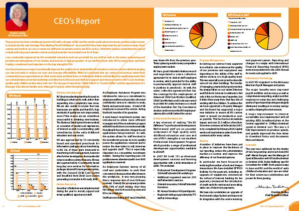 Our focus has been on ways to continually improve the quality of our early childhood education and care services while leveraging our size and scale to reduce our costs and increase affordability. While it is essential that our centres and services retain their community base, responsiveness to their community and their focus on individual children and families, it is equally important that our administration provides leadership and direction to KU and sees itself as a support and resource centre to KU’ s core business: quality early childhood education and care. The change of name from“ Head Office” to“ Central Office” and the appointment of a Manager Educational Quality and a Manager Property, reflect that philosophy.