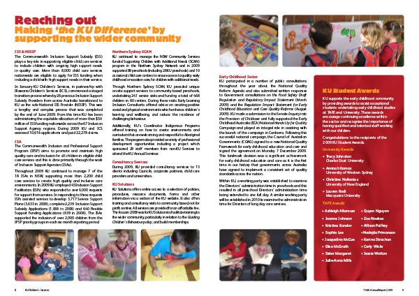 In January KU Children’ s Services, in partnership with Illawarra Children’ s Services( ICS), commenced a staged transition process whereby 28 previous Inclusion Support Subsidy Providers from across Australia transitioned to KU as the sole National ISS Provider( NISSP). This was a lengthy and complex process that was completed by the end of June 2009. From this time KU has been administering the equitable allocation of more than $ 50 million of ISS funding nationwide across the 67 Inclusion Support Agency regions. During 2009 KU and ICS assessed 10,616 applications and paid 22,278 claims.