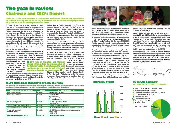 During 2011, KU continued to implement our Strategic Plan“ Making the KU Difference” with our major focus on continually improving the quality of our early childhood education and care services and programs whilst being conscious of our fees remaining affordable for families.