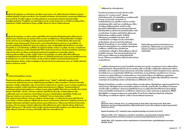 Sovellusta testatessa luotiin alusta, jonka aiheena oli ”ruoka ja minä”. Ideana tehtävänannolle oli mahdollisuus työskennellä kotona, tuoda esiin omaa koti- ja ruokakulttuuria, ja samalla tutustua muiden toimintatapoihin sekä itse sovellukseen. Aihe oli helposti lähestyttävä, minkä avulla pystyttiin pikkuhiljaa pureutumaan kulttuuri-identiteettiin ja yhteisesti ymmärtämään, mitä se tarkoittaa. Sovellus mahdollisti aiheeseen johdatuksen uudella tavalla. Sisältöä rakentaessa projektiin huomasi, että sovelluksella on helppo luoda esimerkiksi ruokaohjeita, eli prosessien kuvaukseen Explain Everything on oiva työkalu. Videoiden ja kuvien upottaminen luo matalan kynnyksen osallistua, mikäli kokee piirtämisen sovelluksella vaikeaksi. Videotallenne vääristi projektia lopussa. Osa elementeistä katosi ja siitä seurasi vilkkuvaa ja epämiellyttävää kuvaa. Oikeassa projektissa tällaista katoamista ei tapahtunut.
