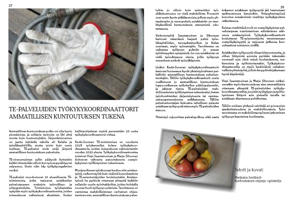 Virpi Saastamoinen ja Merja Sihvonen rohkai-sevatkin myös kuntoutuksen alan ammattilaisia ottamaan yhteyttä TE-palveluiden työkyky-koordinaattoreihin, jos jokin työkykyyn ja työllis-tymiseen liittyvä asia yleisellä tasolla tai asiakkaan tilanteessa pohdituttaa.