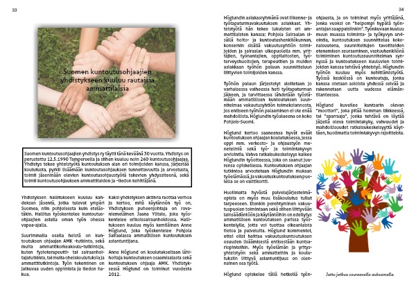 Kaksi yhdistyksen aktiivia raottaa verhoa ja kertoo, mitä käytännön työ on. Yhdistyksen puheenjohtaja on rova-niemeläinen Jaana Ylitalo, joka työs-kentelee erikoissairaanhoidossa. Halli-tukseen kuuluu myös kemiläinen Anne Höglund, joka työskentelee Pohjola Sairaalassa ammatillisen kuntoutuksen asiantuntijana.