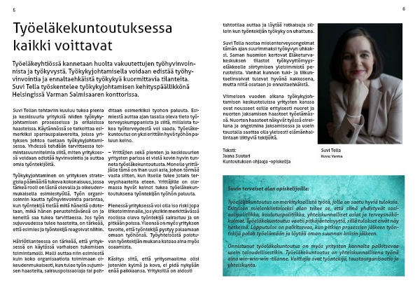 Suvi Tellan tehtäviin kuuluu tukea pieniä ja keskisuuria yrityksiä niiden työkyky-johtamisen prosesseissa ja erilaisissa haasteissa. Käytännössä se tarkoittaa esi-merkiksi sparrauspalavereita, joissa yri-tyksen johtoa tuetaan työkykyjohtami-sessa. Yhdessä tehdään tarvittaessa toi-mintasuunnitelmia siitä, miten yritykses-sä voidaan edistää hyvinvointia ja auttaa omia työntekijöitä.