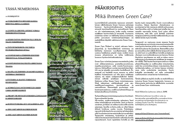 Tämän julkaisun myötä sinulla on mahdollisuus tutustua Green Careen laajemmin. Luvassa on kiinnostavia tarinoita ja näkökulmia suomalai-sesta Green Care -toiminnasta.