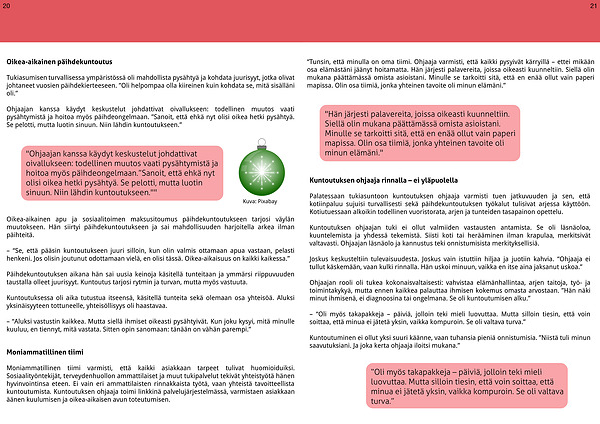 Moniammatillinen tiimi varmisti, että kaikki asiakkaan tarpeet tulivat huomioiduiksi. Sosiaalityöntekijät, terveydenhuollon ammattilaiset ja muut tukipalvelut tekivät yhteistyötä hänen hyvinvointinsa eteen. Ei vain eri ammattilaisten rinnakkaista työtä, vaan yhteistä tavoitteellista kuntoutumista. Kuntoutuksen ohjaaja toimi linkkinä palvelujärjestelmässä, varmistaen asiakkaan äänen kuulumisen ja oikea-aikaisen avun toteutumisen.