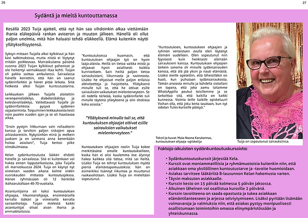 Kelan sydänkuntoutusta lääkäri ehdotti hänelle jo sairaalassa. Sitä ei kuitenkaan voi hakea ennen lopputarkastusta, joka Tuijalla oli marraskuussa 2024. Tuija on käynyt nyt viimeisen vuoden aikana kolme viiden vuorokauden mittaista kuntoutusjaksoa.