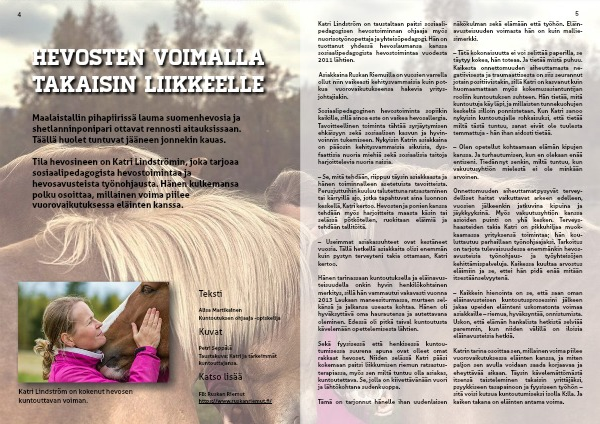 Tila hevosineen on Katri Lindströmin, joka tarjoaa sosiaalipedagogista hevostoimintaa ja hevosavusteista työnohjausta. Hänen kulkemansa polku osoittaa, millainen voima piilee vuorovaikutuksessa eläinten kanssa.