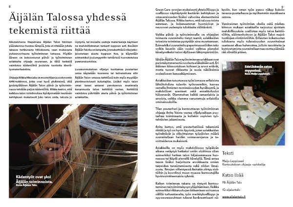 Ohjaaja Riikka Nikolalla on muotoilijan ja sosionomin AMK-tutkinnot, jotka ovat hyvä yhdistelmä, sillä jyväskyläläisen Äijälän Talon päivä- ja työtoimin-nassa tehdään paljon kädentöitä. Riikka kertoo, että kaikissa talon toiminnoissa hyödynnetään kestävän kehityksen mukaisesti joko talon omia, talosta jo löytyviä, tai muualta saatuja materiaaleja käyttäen ne mahdollisimman tarkasti loppuun asti. Kesäisin Äijälän Talolla on lampaita, joista kerittävä villa jatko-jalostetaan alusta loppuun itse, ja käytetään esimerkiksi joulumyyntiin tehtävissä huovutetuissa pannunalustoissa.