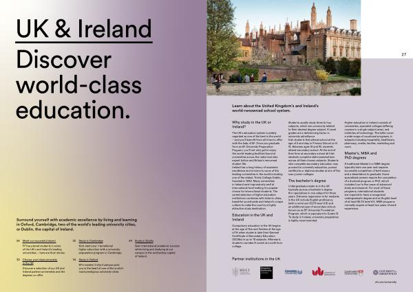 The UK ’ s education system is widely regarded as one of the best in the world – and you ’ ll benefit from all it has to offer with the help of EF . Once you graduate from an EF University Preparation Program , you ’ ll not only get to enjoy the world-leading facilities found at universities across the nation but also expert tuition and Britain ’ s renowned student life . Ireland has a long history of academic excellence and is home to some of the leading universities in the world including one of the oldest , Trinity College Dublin , founded in 1592 . Many universities in Ireland rank impressively well at international level making it a popular choice for international students . The varied selection of higher education institutions combines with historic cities , beautiful countryside and Ireland ’ s unique culture to make the country a highly attractive study destination .