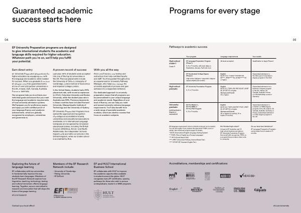 EF University Preparation prepares you for higher education by equipping you with the language and academic skills needed for success . When you graduate from your EF program , you ’ ll be guaranteed entry at one of over 230 partner universities in the UK , Ireland , USA , Canada , Australia , France or Germany .
