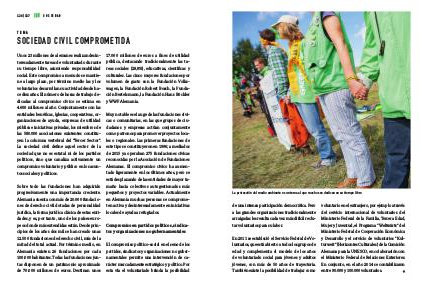 Unos 23 millones de alemanes realizan desinteresadamente tareas de voluntariado durante su tiempo libre, asumiendo responsabilidad social. Este compromiso a menudo se mantiene a largo plazo, por término medio las y los voluntarios desarrollan su actividad desde hace diez años. El número de horas de trabajo dedicadas al compromiso cívico se estima en 4.600 millones al año. Conjuntamente con las entidades benéficas, Iglesias, cooperativas, organizaciones de ayuda, empresas de utilidad pública e iniciativas privadas, los miembros de las 580.000 asociaciones existentes constituyen la columna vertebral del“ Tercer Sector”. La sociedad civil define aquel sector de la sociedad que no es estatal ni de los partidos políticos, sino que canaliza activamente un compromiso voluntario y público en los asuntos sociales y políticos.