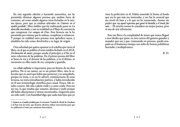 La célula infinita es importante para mí dentro de mi obra poética . No es un tanteo , no es un primer libro , sino la selección que yo sentí que había que preservar y no aniquilarla , porque no tenía , o yo no lo advertí , reminiscencias de otras lecturas , no tenía retroalimento poético , y había introducido en él una terminología científica poco usual . Fresca . Me sonaba a nuevo . Me olía a jabón verde y a carne cruda . Pero era mi voz , la que tendría que someter , ahormar y pulir porque allí había aliteraciones y ritmos encontrados , traqueteos para un oído sutil . Con humildad digo que nada más lejos que yo