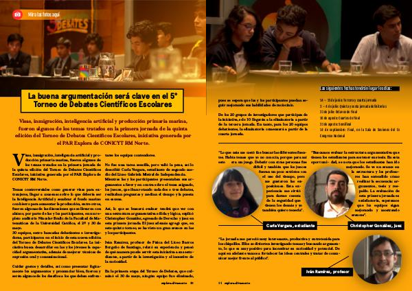“ Buscamos evaluar la estructura argumentativa que tienen los estudiantes para sostener sus tesis. En esta oportuni- dad, se nota que los estudiantes han ido mejorando. Se ve un avance en la estructura y los profesores han entendido cómo realizar la secuencia: argumentos, tesis y respaldo. La evaluación de esta primera jornada es satisfactoria, esperamos que los equipos sigan mejorando y mostrando avances”.