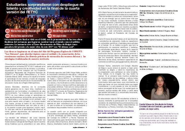 Obras de gran calidad teatral y contenido científico se presentaron en la final del FETYC 2017, realizado en el GAM, el pasado viernes 20 de octubre. La iniciativa, organizada en forma conjunta por los Proyectos Asociativos Regionales del Programa Exploraa de CONICYT en la Región Metropolitana y el Centro Gabriela Mistral, GAM, tiene como objetivo fomentar el aprendizaje de las ciencias a través de lenguajes propios de las artes escénicas en los estudiantes de educación media de la Región Metropolitana.