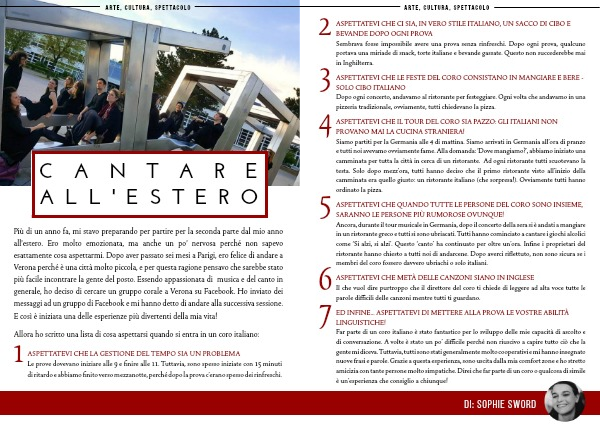Far parte di un coro italiano è stato fantastico per lo sviluppo delle mie capacità di ascolto e di conversazione. A volte è stato un po’ difficile perché non riuscivo a capire tutto ciò che la gente mi diceva. Tuttavia, tutti sono stati generalmente molto cooperativi e mi hanno insegnato nuove frasi e parole. Grazie a questa esperienza, sono uscita dalla mia comfort zone e ho stretto amicizia con tante persone molto simpatiche. Direi che far parte di un coro o qualcosa di simile è un’esperienza che consiglio a chiunque!