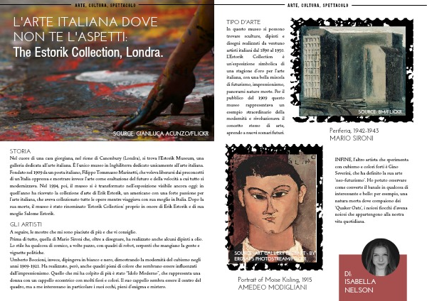 Nel cuore di una casa giorgiana, nel rione di Canonbury (Londra), si trova l’Estorik Museum, una galleria dedicata all’arte italiana. È l’unico museo in Inghiliterra dedicato unicamente all’arte italiana. Fondato nel 1909 da un poeta italiano, Filippo Tommasso Marinetti, che voleva liberarsi dai preconcetti di un’Italia oppressa e mostrare invece l’arte come esaltazione del futuro e della velocità a cui tutto si modernizzava. Nel 1994, poi, il museo si è transformato nell’esposizione visibile ancora oggi: in quell’anno ha ricevuto la collezione d’arte di Erik Estorik, un americano con una forte passione per l’arte italiana, che aveva collezionato tutte le opere mentre viaggiava con sua moglie in Italia. Dopo la sua morte, il museo è stato rinominato ‘Estorik Collection’ proprio in onore di Erik Estorik e di sua moglie Salome Estorik.