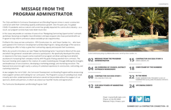 In this issue , we provide an overview of some of our “ Navigating Contracting Opportunities ” outreach workshops featuring Los Angeles Councilmembers and special guests who have partnered with our Program to help inform contractors about available project opportunities .