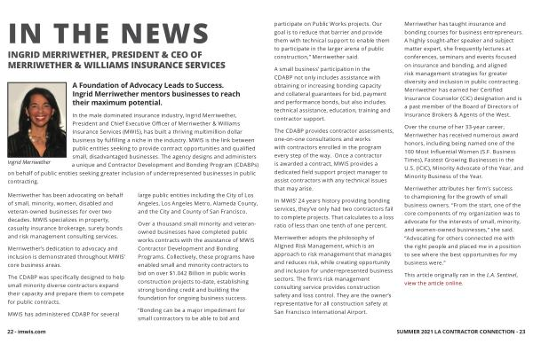 In the male dominated insurance industry , Ingrid Merriwether , President and Chief Executive Officer of Merriwether & Williams Insurance Services ( MWIS ), has built a thriving multimillion dollar business by fulfilling a niche in the industry . MWIS is the link between public entities seeking to provide contract opportunities and qualified small , disadvantaged businesses . The agency designs and administers a unique and Contractor Development and Bonding Program ( CDABPs ) on behalf of public entities seeking greater inclusion of underrepresented businesses in public contracting .