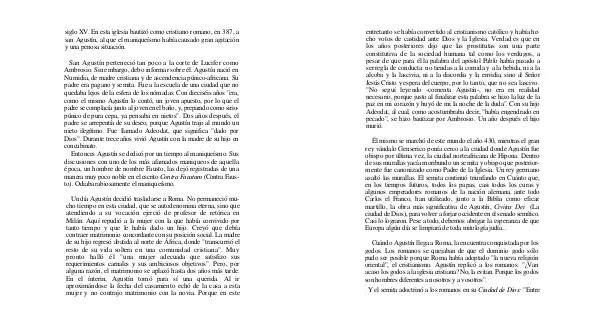 entretanto se había convertido al cristianismo católico y había hecho votos de castidad ante Dios y la Iglesia. Verdad es que en los años posteriores dijo que las prostitutas son una parte constitutiva de la sociedad humana tal como los verdugos, a pesar de que para él la palabra del apóstol Pablo había pasado a ser regla de conducta: no tiendas a la comida y a la bebida, ni a la alcoba y la lascivia, ni a la discordia y la envidia, sino al Señor Jesús Cristo y espera del cuerpo, por lo tanto, que no sea lascivo. " No seguí leyendo-comenta Agustín-, no era en realidad necesario, porque justo al finalizar esta palabra se hizo la luz de la paz en mi corazón y huyó de mi la noche de la duda ". Con su hijo Adeodat, al cual, como acostumbraba decir, " había engendrado en pecado ", se hizo bautizar por Ambrosio. Un año después el hijo murió.