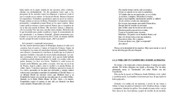 Se lo prometí, y mantendré mi promesa. En otra ocasión estuvimos juntos en Montségur, dejamos el coche en la carretera, bajo el caserío, y fuimos al Camp des Crémais, Campo de las hogueras. Las matas de remolachas forrajeras abundaban. Guardamos silencio y levantamos la vista hacia el castillo que en el interin el ingeniero bordelés y buscador de tesoros había abandonado. Los medios económicos de la " sociedad secreta " de la que me había hablado se habían acabado demasiado pronto. Le hablé a la condesa sobre mi patria alemana. Lo hice con fervor. También le conté acerca de nuestro poeta Hólderin, que, pobre y acosado, vivió una vez en el sur de Francia. Aquí lo golpeó, como le escribió a su amada Diolma, de súbito, Apolo. Y mientras rememoro a Hölderin, quieran los manes de los cátaros quemados en las piras por clerizontes y monjes sentirse todavía más consolados esperando reconfortados el Día del Juicio y a su tribunal. Recité los mismos versos que Hölderin hace a su Empédocles lanzar a la cara de un cura antes que él, ya sobre el Etna- llamado en la Edad Media Monte de Bel-, fuera a la muerte. Empédodes siguió el camino al más allá con Dietrich von Bern como ejemplo. Despreciaba a los curas: