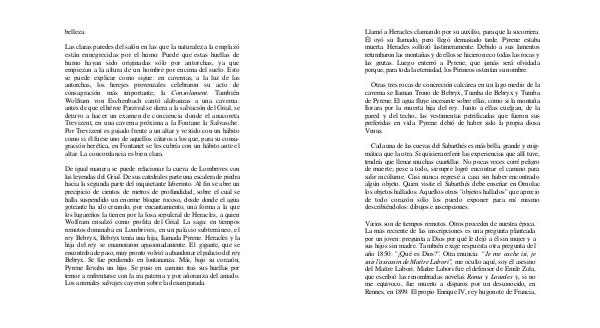 De igual manera se puede relacionar la cueva de Lombrives con las leyendas del Grial. De sus catedrales parte una escalera de piedra hacia la segunda parte del inquietante laberinto. Al fin se abre un precipicio de cientos de metros de profundidad, sobre el cual se halla suspendido un enorme bloque rocoso, desde donde el agua goteante ha ido creando, por encantamiento, una forma a la que los lugareños la tienen por la losa sepulcral de Heracles, a quien Wolfram ensalzó como profeta del Grial. La saga: en tiempos remotos dominaba en Lombrives, en un palacio subterráneo, el rey Bebryx, Bebryx tenía una hija, llamada Pyrene. Heracles y la hija del rey se enamoraron apasionadamente. E1 gigante, que se encontraba de paso, muy pronto volvió a abandonar el palacio del rey Bebryx. Se fue perdiendo en lontananza. Más, bajo su corazón, Pyrene llevaba un hijo. Se puso en camino tras sus huellas por temor a enfrentarse con la ira paterna y por añoranza del amado. Los animales salvajes cayeron sobre la desamparada.