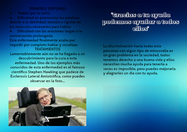 Lamentablemente aún no se ha llegado a un descubrimiento para la cura a esta enfermedad. Uno de los ejemplos más conocidos de esta enfermedad es el famoso científico Stephen Hawking que padece de Esclerosis Lateral Amiotrófica, como puedes observar en la foto...