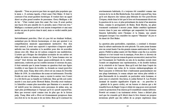 avertissements habituels , il a toujours été considéré comme une version de la vie de Bix Beiderbecke . Son intérêt aujourd ’ hui , bien qu ’ il soit dépouvu des valeurs plus libérales de l ’ ère post-Droits Civiques , réside dans le fait que le livre est étonnamment direct sur la question de la race , et plus précisément du statut d ’ un musicien blanc , comme le protagoniste de Baker , Rick Martin , un génie tourmenté condamné à mourir jeune . Baker semblait également trouver dans le jazz une esthétique qui suspendait les divisions binaires habituelles entre l ’ homme et la femme , une pensée intrigante lorsque l ’ on considère les aspects “ féminins ” du jeu et du chant de Chet Baker .