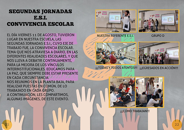 EL DÍA VIERNES 11 DE AGOSTO, TUVIERON LUGAR EN NUESTRA ESCUELA, LAS SEGUNDAS JORNADAS E.S.I., CUYO EJE DE TRABAJO FUE, LA CONVIVENCIA ESCOLAR. TEMA QUE NOS ATRAVIESA A DIARIO, EN LAS DIFERENTES REALIDADES ESCOLARES, Y QUE NOS LLEVA A DEBATIR CONTINUAMENTE, PARA LA MEJORA DE LOS VÍNCULOS INTERINSTITUCIONALES. EDUCAMOS PARA LA PAZ, QUE SIEMPRE DEBE ESTAR PRESENTE EN CADA CIRCUNSTANCIA.