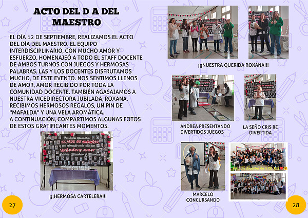 EL DÍA 12 DE SEPTIEMBRE, REALIZAMOS EL ACTO DEL DÍA DEL MAESTRO. EL EQUIPO INTERDISCIPLINARIO, CON MUCHO AMOR Y ESFUERZO, HOMENAJEÓ A TODO EL STAFF DOCENTE DE AMBOS TURNOS CON JUEGOS Y HERMOSAS PALABRAS. LAS Y LOS DOCENTES DISFRUTAMOS MUCHO, DE ESTE EVENTO. NOS SENTIMOS LLENOS DE AMOR, AMOR RECIBIDO POR TODA LA COMUNIDAD DOCENTE. TAMBIÉN AGASAJAMOS A NUESTRA VICEDIRECTORA JUBILADA, ROXANA. RECIBIMOS HERMOSOS REGALOS, UN PIN DE "MAFALDA" Y UNA VELA AROMÁTICA.