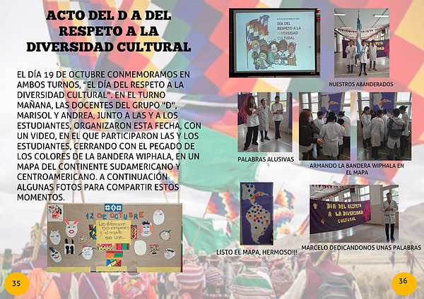 EL DÍA 19 DE OCTUBRE CONMEMORAMOS EN AMBOS TURNOS, "EL DÍA DEL RESPETO A LA DIVERSIDAD CULTURAL". EN EL TURNO MAÑANA, LAS DOCENTES DEL GRUPO "D", MARISOL Y ANDREA, JUNTO A LAS Y A LOS ESTUDIANTES, ORGANIZARON ESTA FECHA, CON UN VIDEO, EN EL QUE PARTICIPARON LAS Y LOS ESTUDIANTES, CERRANDO CON EL PEGADO DE LOS COLORES DE LA BANDERA WIPHALA, EN UN MAPA DEL CONTINENTE SUDAMERICANO Y CENTROAMERICANO. A CONTINUACIÓN ALGUNAS FOTOS PARA COMPARTIR ESTOS MOMENTOS.
