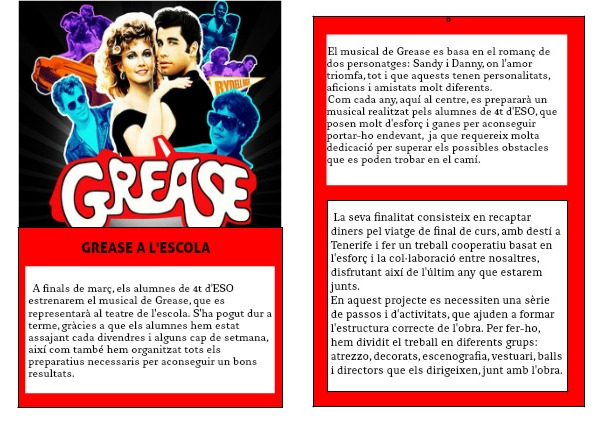 Com cada any, aquí al centre, es prepararà un musical realitzat pels alumnes de 4t d'ESO, que posen molt d'esforç i ganes per aconseguir portar-ho endevant, ja que requereix molta dedicació per superar els possibles obstacles que es poden trobar en el camí.