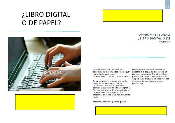 En mi opinión, creo que el uso de libros es mucho mejor que la tecnología, porque así, podemos escribir y ayudar a nuestra caligrafía. Por lo contrario, utilizando tablets o ordenadores, sólo teneos que presionar botones y no nos beneficia nada.