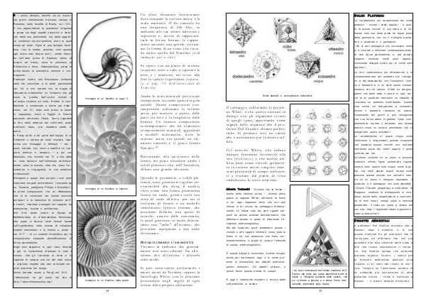 S O L I D I P L A T O N I C I La caratteristica più appariscente dei solidi platonici- ovvero i solidi regolari- è quella di essere inscritti in una sfera e di utilizzare solo una delle prime tre figure piane della geometria, per cui il triangolo equilatero il quadrato e il pentagono.( Se si vuol proseguire con successive forme si è costretti a utilizzare contemporaneamente due figure geometriche e, per questo, vengono chiamati solidi semi regolari. Archimede disegnò tredici tipi di solidi semi regolari.) La loro caratteristica più affascinante è la complementarietà del quadrato con l ' ottagono e del dodecaedro con l ' icosaedro, invece il tetraedro è in un certo senso complementare con sè stesso. Infatti se congiungiamo con delle rette il centro di ogni faccia di un quadrato tracciamo un ottaedro e viceversa se partiamo dall ' ottaedro. Questo vale anche col dodecaedro e icosaedro, invece il tetraedro riproduce sè stesso. Osservando tali giochi si può immaginare che una forma abbia in grembo l ' altra complementare, mentre il tetraedro può essere definito come un essere primordiale che si autogenera senza mutazioni. Le caratteristiche di questi cinque solidi continuano a sorprenderci quando scopriamo che possono essere inscritti uno nell ' altro sfruttando parte dei vertici oppure il punto centrale dei lati. Un ' ultima curiosità su un piano si possono tracciare infinite figure poliedriche regolari mentre nello spazio solo cinque solidi regolari, ma nello spazio questi cinque solidi possono essere inscritti uno nell ' altro mentre su un piano il triangolo equilatero, il quadrato e il pentagono non sono inscrivibili.( Gianni Crovatto progettista e costruttore, di Bergamo, studioso di Antroposofia si interessa anche della progettazione e costruzione di forni solari, orologi solari e strutture geodetiche. Il testo qui sopra è ripreso dal suo sito: http:// digilander. libero. it / giannicrovatto / g-platon. htm)