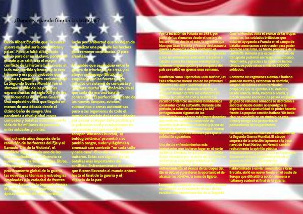 El cambio que se produjo entre la guerra de trincheras de 1914 y el ataque relámpago (Blitzkrieg) empleado por las fuerzas nazis provocó un sistema de conquista y combate mucho más dinámico, en el que cada día era una batalla contrarreloj. El perfeccionamiento de los nuevos tanques, aviones, submarinos o armas automáticas puso a los ingenieros de todo el mundo al servicio de las necesidades por causar el mayor daño posible y a la población civil y combatientes en un paredón del que era difícil escapar. Winston Churchill, ‘el buldog británico’ prometió a su pueblo sangre, sudor y lágrimas y amenazó con combatir "en cada calle y cada casa". Él lo dijo, pero todos lo imitaron. Estas son algunas de las batallas más importantes del conflicto. Enfrentamientos decisivos que fueron llevando al mundo entero hasta el final de la guerra y el silencio de la paz.