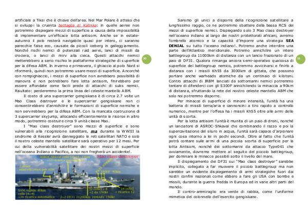 artificiale a Tiksi che è chiave dell’ area. Nel Mar Polare è atteso che si sviluppi la cruenta battaglia di Kalinka: in quelle aeree non potremmo dispiegare mezzi di superficie a causa della impossibilità di implementare un’ efficace lotta antisom. Anche se in estateautunno il polo resterà navigabile quasi per intero, ci saranno parecchie false eco, causate da piccoli iceberg in galleggiamento. Nonché rischi nemici di potenziali raid aerei, lanci di missili da crociera, o lanci di mirv alla cieca. Questi attacchi nemici metterebbero a serio rischio le piattaforme strategiche di superficie per la difesa ABM. In inverno e primavera, il ghiaccio al polo Nord si riformerà, quindi non potremmo usare mezzi di superficie. Ancorché con rompighiaccio, i mezzi di superficie non avrebbero possibilità di manovra e non potrebbero fare lotta antisom, finirebbero per essere affondate come facili prede di attacchi di subs nemici. Risultato: perderemmo la prima linea del celeste mantello ABM.